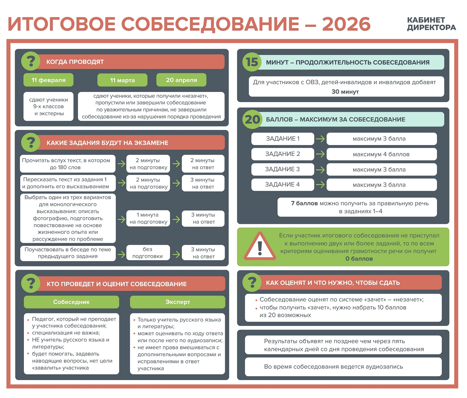 - О датах проведения итогового собеседования по русскому языку, порядке проведения и порядке проверки итогового собеседования, о сроках, местах и порядке информирования о результатах итогового собеседования по русскому языку в 2026 году
